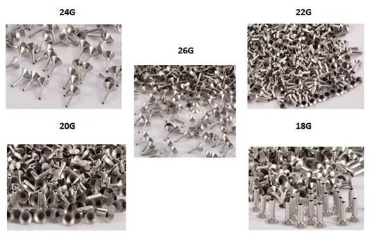 鉚釘選用進口不銹鋼材料,進行伸拉成型制作,具有優異的耐腐蝕性和尺寸穩定性,產品的表面粗糙度,內外公差需精密控制,外直徑導向位和擴口導向位需符合標準通用尺寸及組裝需求,鉚釘現有規格:18G、20G、22G、24G和26G。